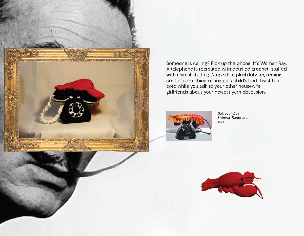 MAMAISM is a movement “re-domestifying” iconic Dada era images into the female context of the industry. Domestic arts - knitting, corchet, ceramics, sewing, handicrafting, decorating, even cooking and cleaning - have long been considered “low art” due to their association with women in the hom. However, these housewife tasks are bursting with vitality, utility, and love. Crocheting is a form of healing, sewing is a way to express love, and ironing your clothes becomes blissfully mundane. Instead of showing beautiful forms of textiles and crafts made with and for care, art museums include “industrial junk” and sexualized imagery from artists like Marcel Duchamp, Man Ray, and Salvador Dali. Each artist had a kind of disguise they operated under. Marcel Duchamp dresssed as Rrose Selavy, Man Ray was just a nickname, and Salvador Dali could barely createt work consciously. Taking on the moniker WOMAN RAY, Anna Koch reinserts the femininity of domestic arts into the fine art world with worded puns and textile mediums. To use the wwords of Baroness Elsa von Freytag-Loringhoven, the silenced woman behind the ideas of Dada, Marcel Duchamp? More like Marcel Dushit!